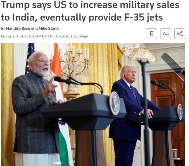 中新网2月14日电 据路透社报道,美国总统特朗普13日表示,美国将从2025年开始大幅增加对印度的军售,并将向印度出售F-35隐形战斗机。